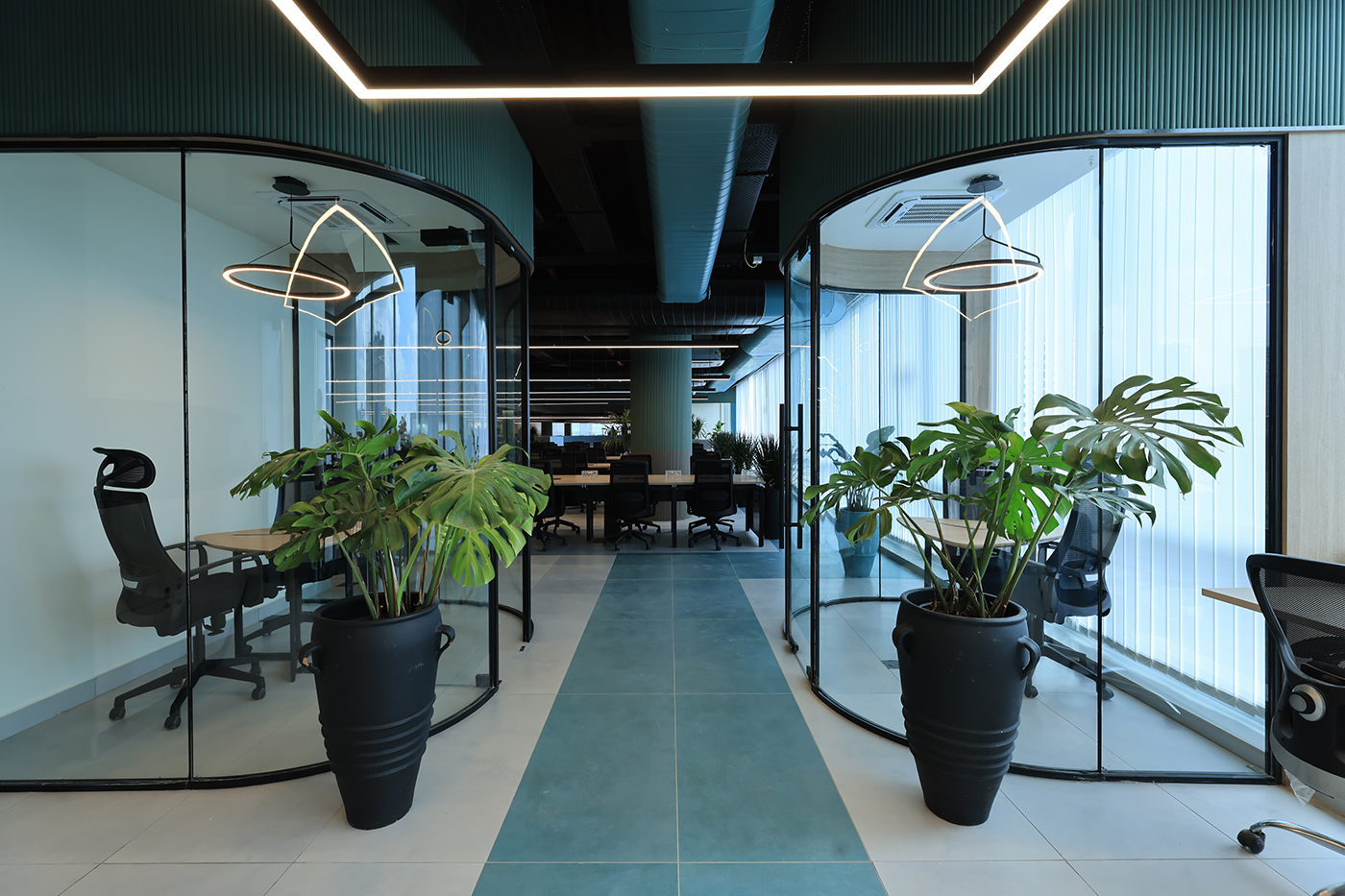 Potted plants, strategically placed at transitional zones, infuse life and freshness, softening the sharpness of glass and metal elements. They also act as natural dividers that enhance biophilic comfort within the workspace.