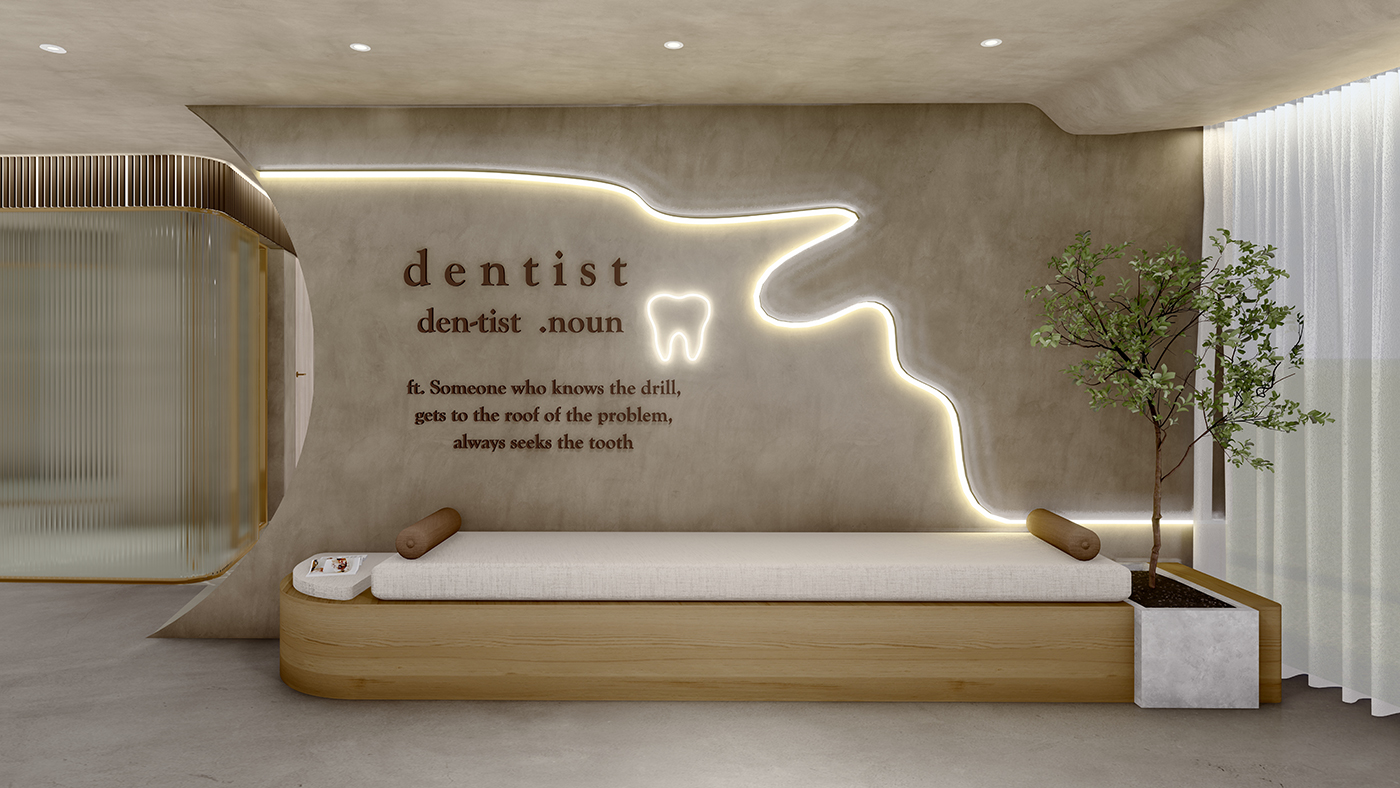 This dental clinic interior blends calm minimalism with natural warmth - soft beige textures, muted lighting, and green accents create a sense of ease and comfort.