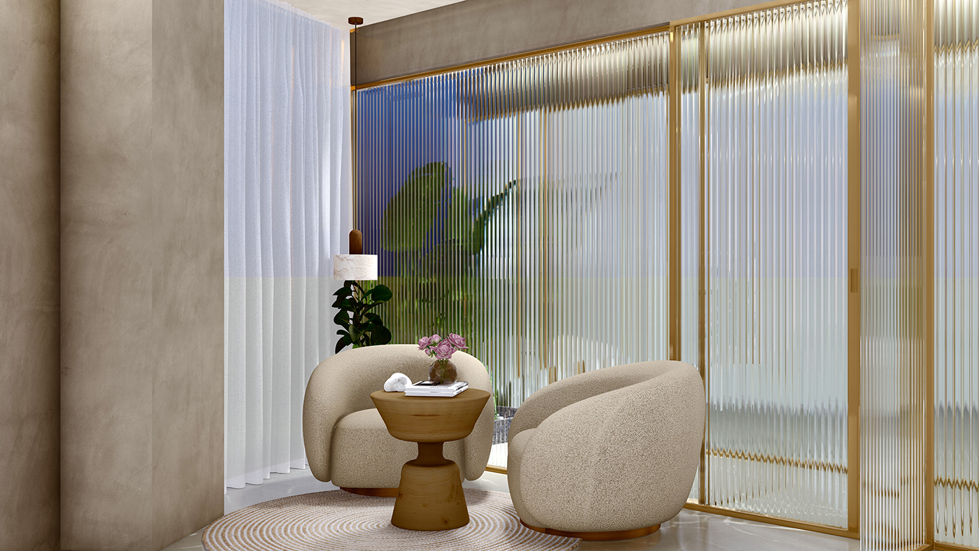 The ribbed glass partitions add privacy while keeping the space visually light. Subtle curves, wooden tones, and indoor greens transform the clinic into a serene, welcoming environment rather than a sterile setup, redefining the way clinical spaces feel.
