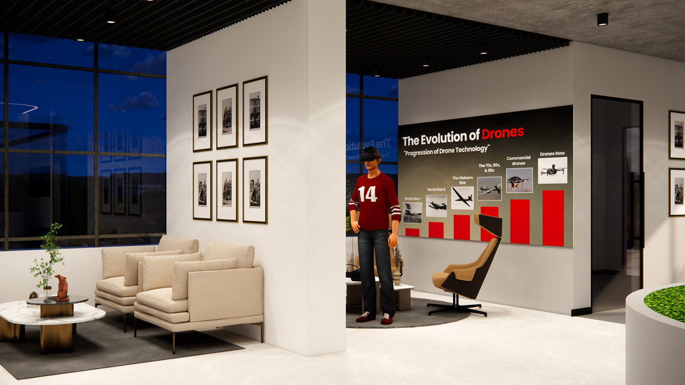 This drone store interior blends modern industrial design with a sleek, tech-inspired aesthetic. Warm wooden textures and marble finishes in the reception area balance the high-tech vibe with a touch of elegance, making the space feel both innovative and inviting.