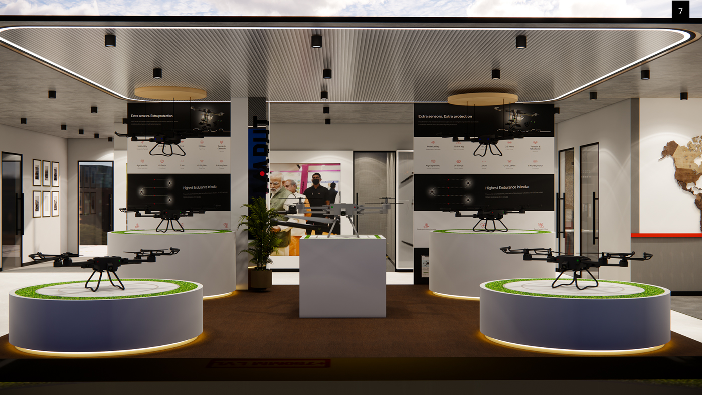 The use of clean lines, metallic tones, and accent lighting highlights the drones as display pieces, creating a gallery-like experience.