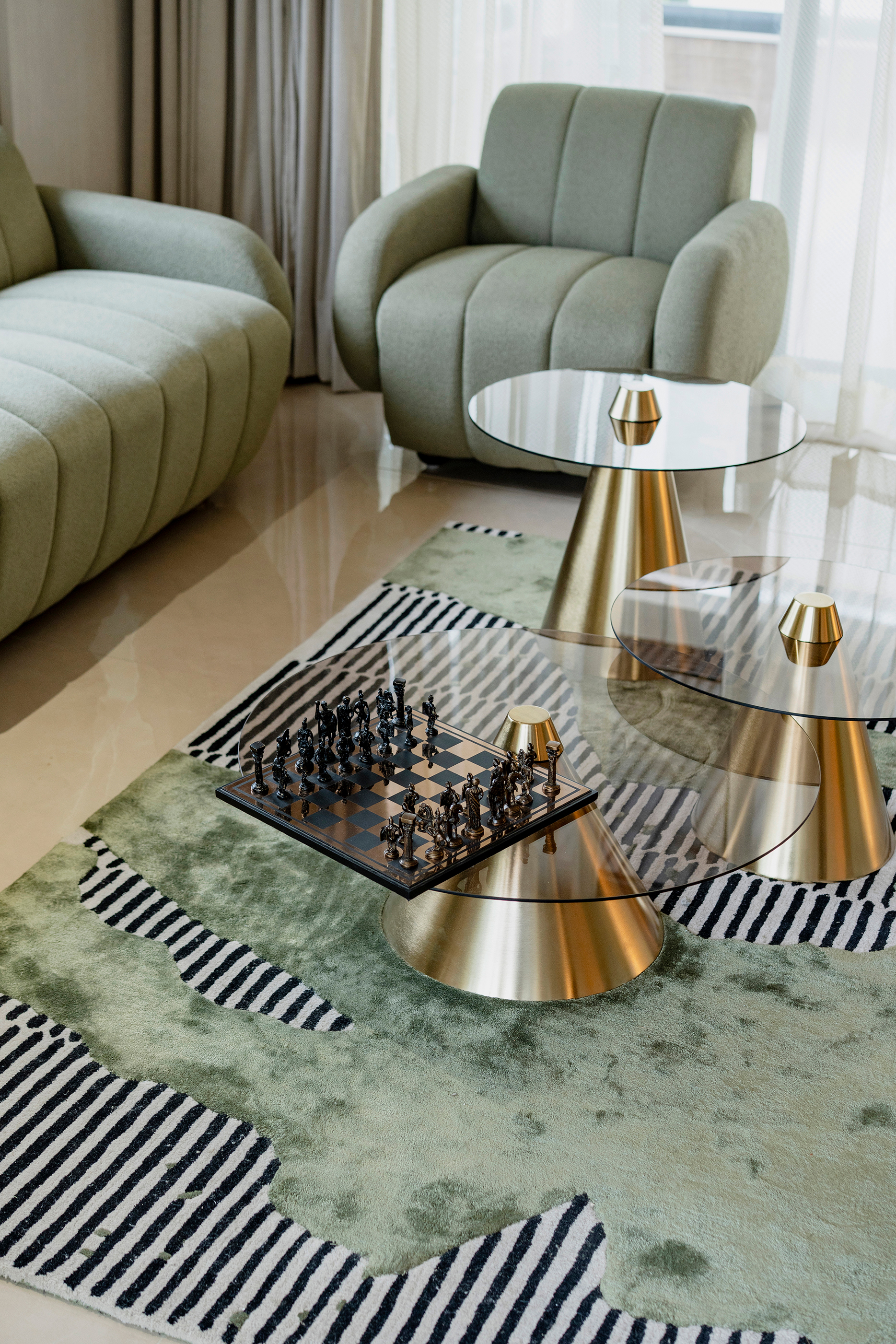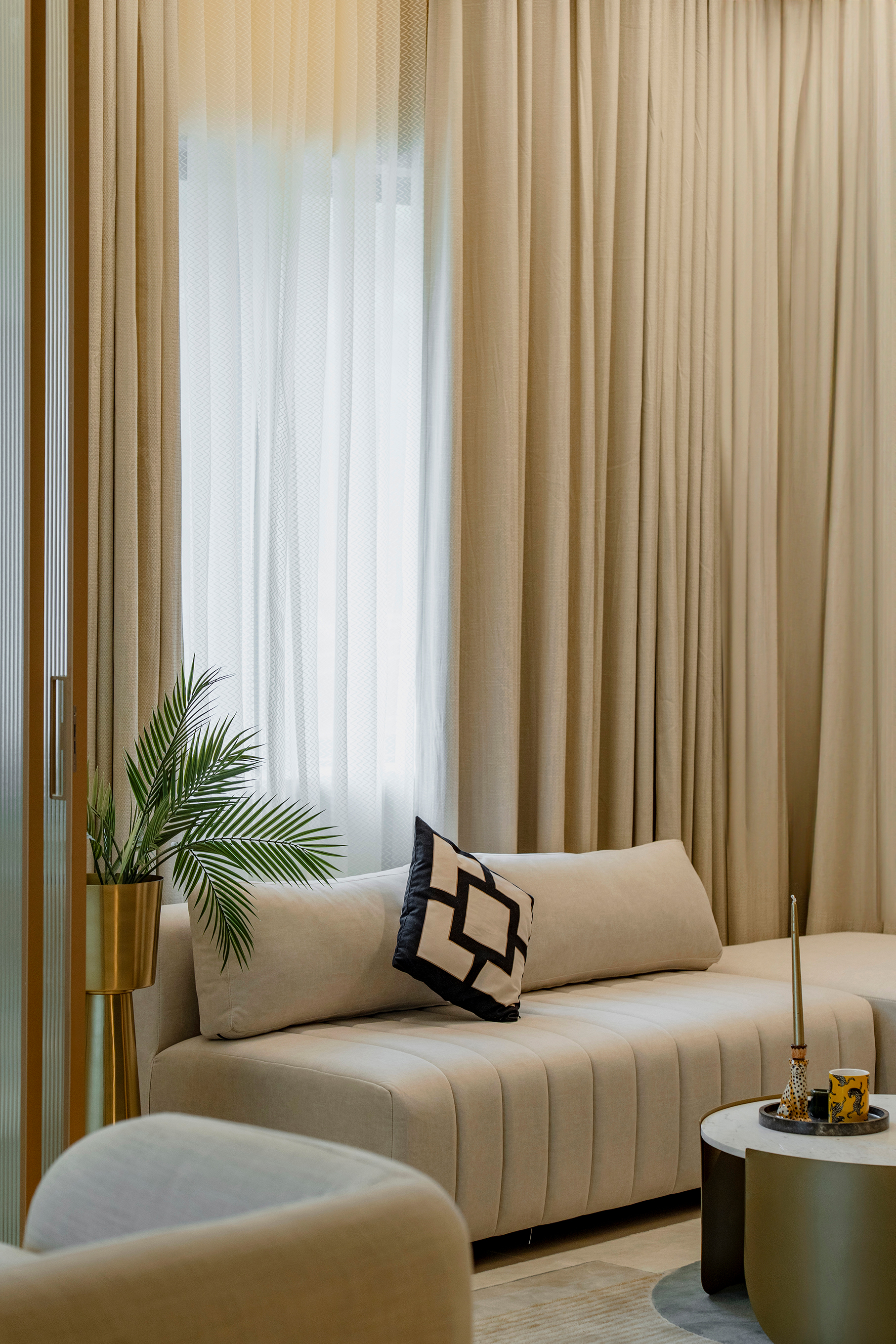 A refined modern aesthetic with soft, curved furniture that enhances comfort and flow within the space. The muted color palette sets a calm and sophisticated tone, complemented by gold accents and sleek glass tables that introduce a touch of understated luxury.