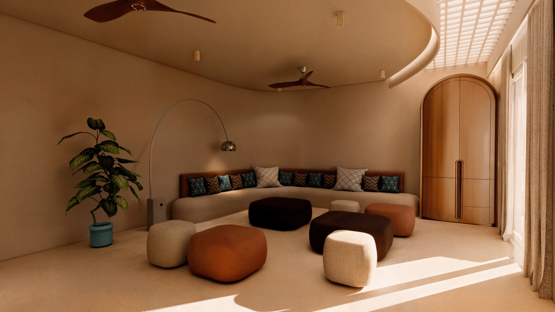 Every space feels calm and airy, enhanced by organic textures and gentle lighting that highlight the architectural softness. Thoughtful detailing, from smooth finishes to refined furniture forms, ties the interiors together, blending functionality with elegance.