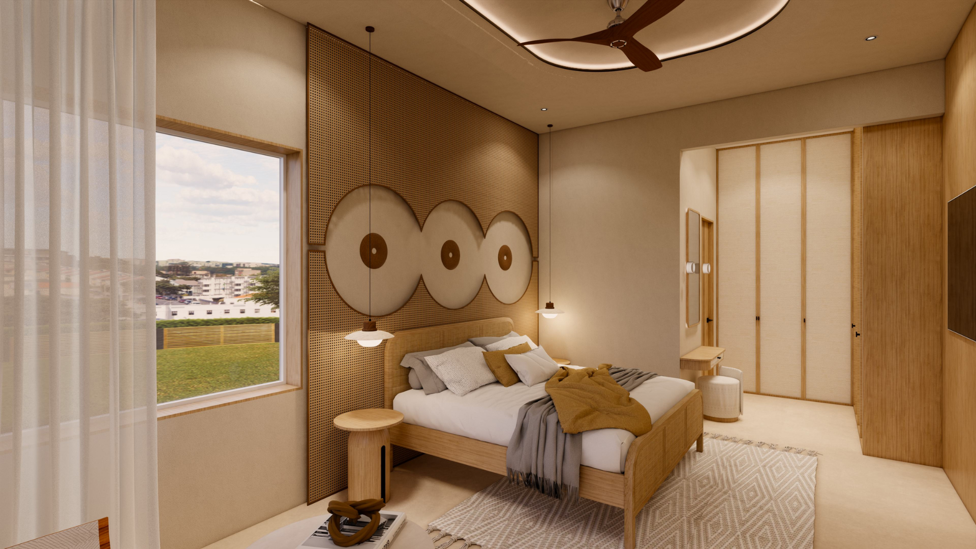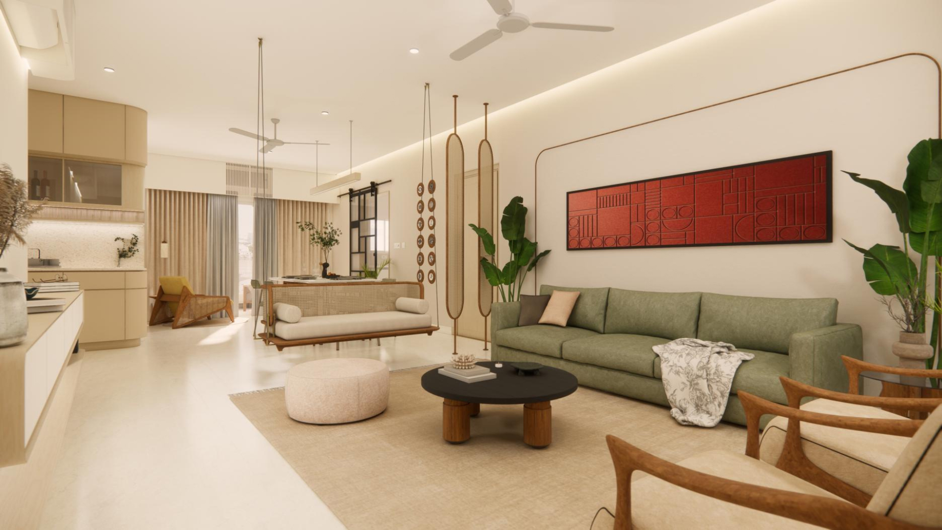 This residence exudes a calm, earthy charm with muted tones and soft textures. The living area blends natural wood, warm lighting, and subtle green accents for a cozy, modern vibe.