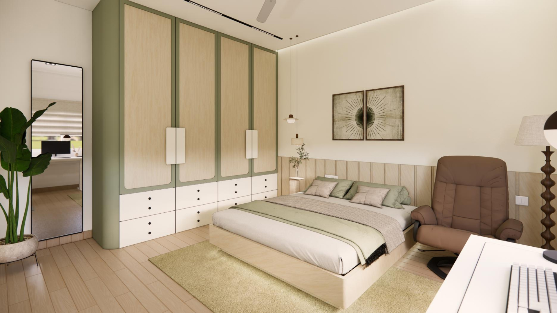 In the bedroom, a palette of pastel greens and light wood continues the soothing theme. Clean lines, built-in storage, and minimal decor emphasize functionality while maintaining a warm, restful ambiance.