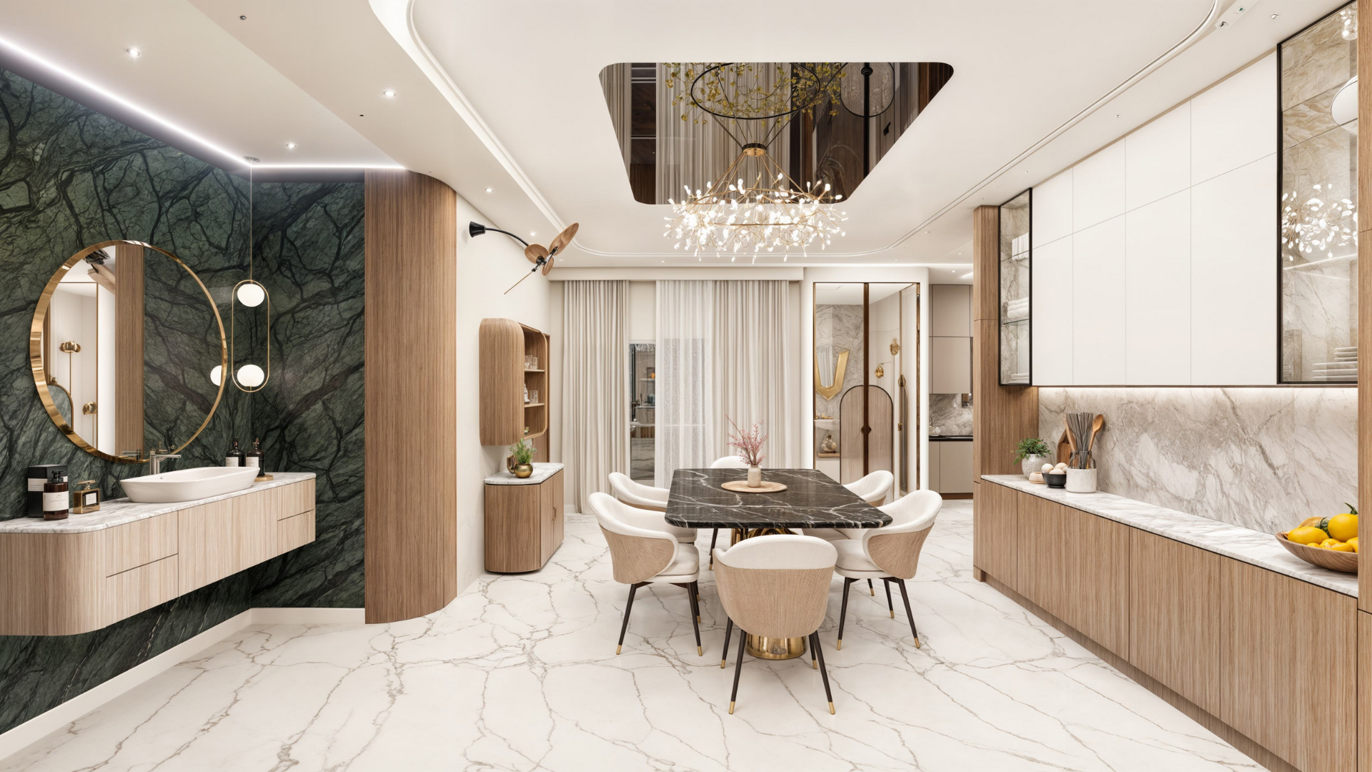 The dining and wash area exude modern luxury with a Emerald green marble backdrop, soft wooden tones, and gold highlights. The elegant chandelier and reflective ceiling enhance the sense of space, while the combination of textures adds warmth and sophistication.