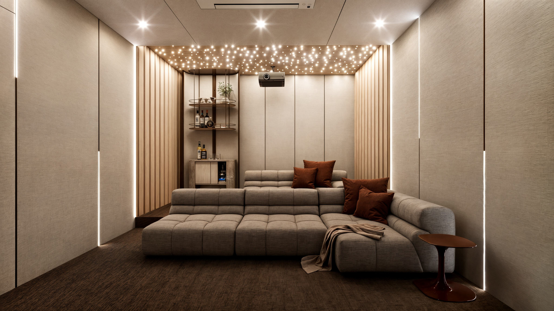 The home theatre features a cozy, contemporary design with acoustic wall panels, warm lighting, and a starry ceiling effect. Plush seating and a built-in bar corner create the perfect atmosphere for relaxation and entertainment.