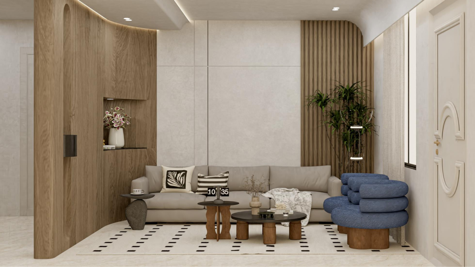 The living area blends soft neutrals with warm wooden accents and subtle curves, creating a cozy and elegant setting. The modern furniture and layered textures and pop of blue enhance the room’s sense of comfort and sophistication.