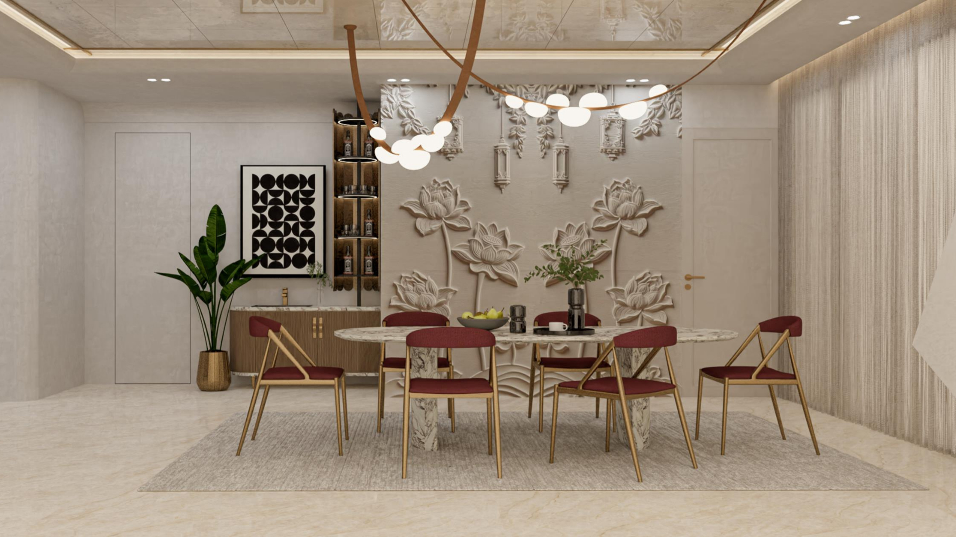 The dining space features a statement lotus wall panel, marble-top table, and bold red chairs that add character. Warm lighting and gold details elevate the refined, artistic ambience of the home.